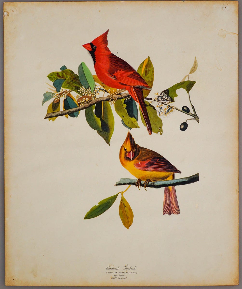 Upea lintugrafiikka John James Audubonin klassisesta The Birds of America -sarjasta. Kuvassa on punakardinaali (Cardinalis cardinalis) – yksi Pohjois-Amerikan tunnetuimmista ja rakastetuimmista linnuista. Teoksessa nähdään sekä kirkkaanpunainen koiras että vaaleampi naaras oksalla, mikä korostaa lajin kaunista sukupuolidimorfismia.