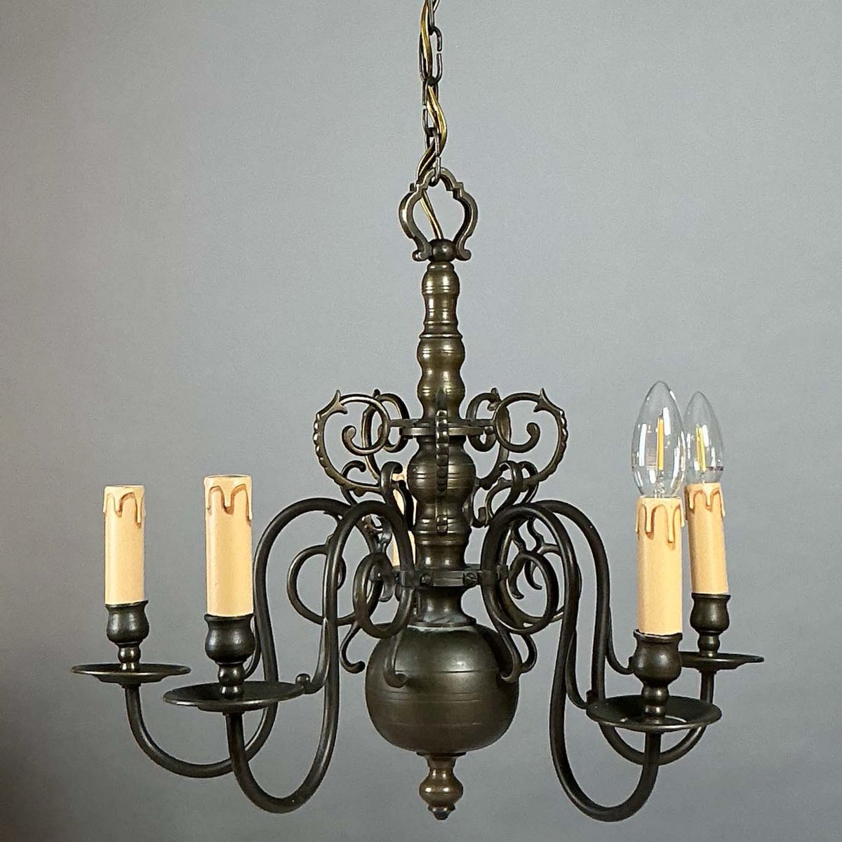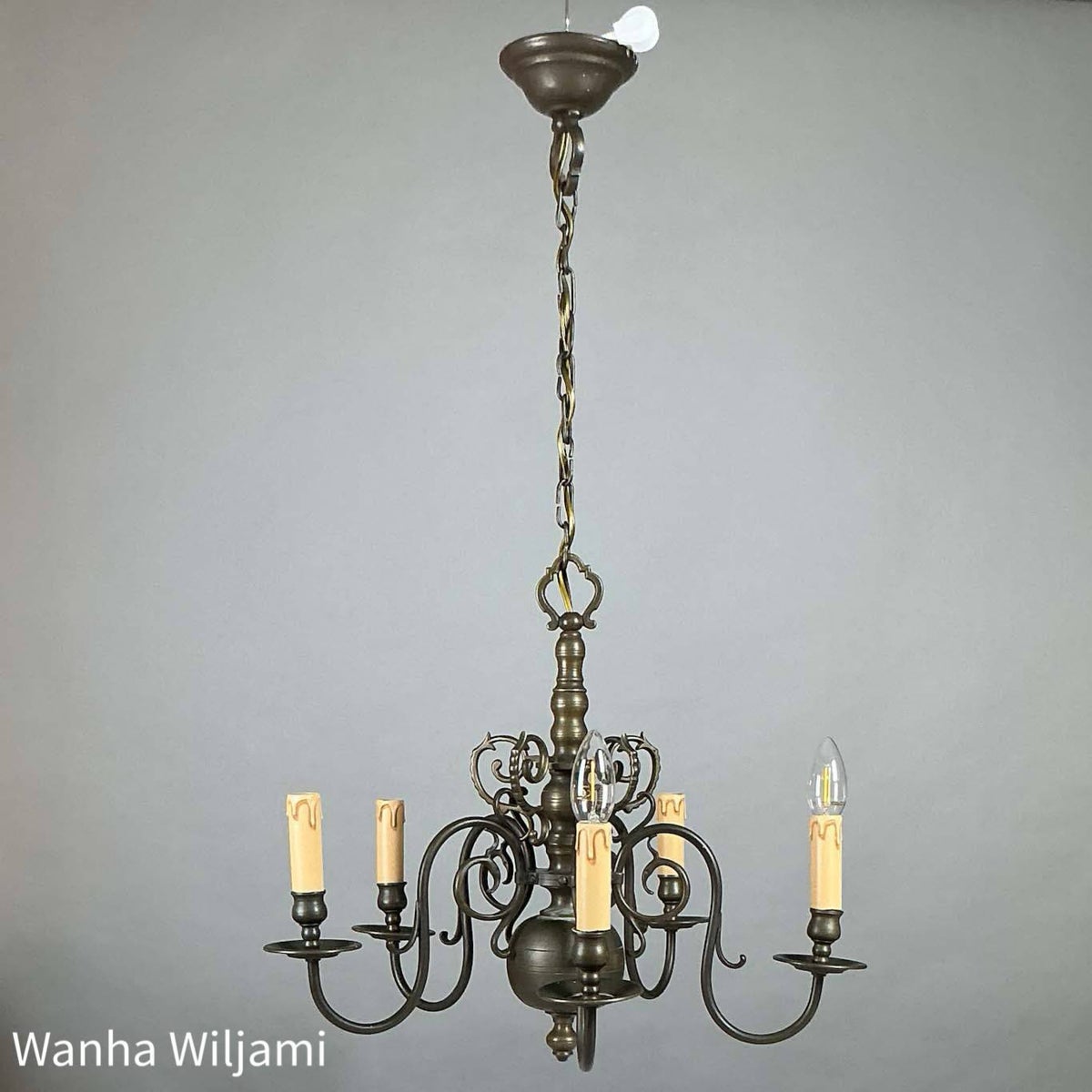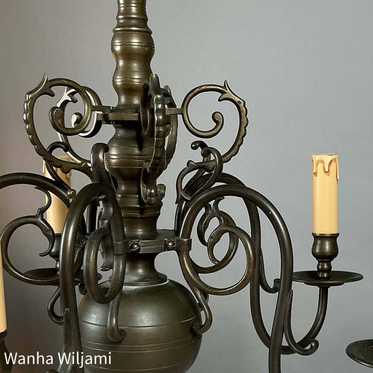 Upea, kuuden valonlähteen kattovalaisin, valmistettu patinoituneesta pronssista. Valaisimessa on barokkityylille ominaiset koristeelliset muodot ja runsaat yksityiskohdat. Tyylikäs patina korostaa sen arvokasta ilmettä ja ajattomuutta.
