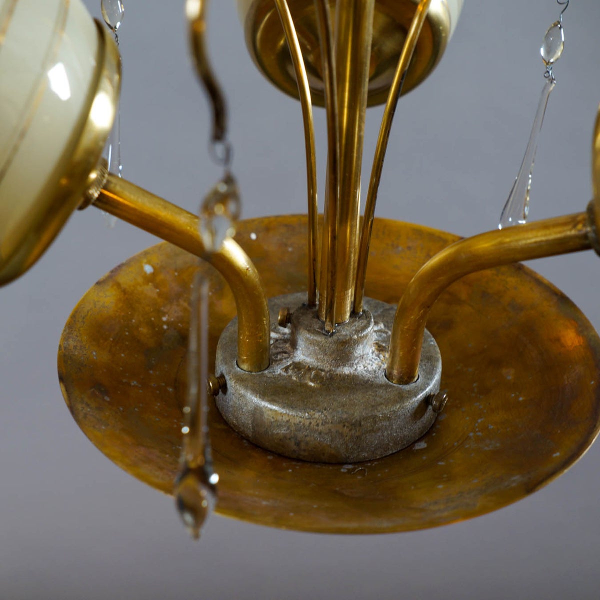 Aito Korumo-valmistajan 1950-luvun kattovalaisin, jossa yhdistyvät ajaton eleganssi ja suomalainen vintage-design. Valaisimessa on lämminsävyinen messinkirunko sekä kolme kaunista lasikupua, joiden vaalea sävy korostuu koristeellisilla vaakaraidoilla ja orgaanisilla, aaltoilevilla viivakuvioilla.