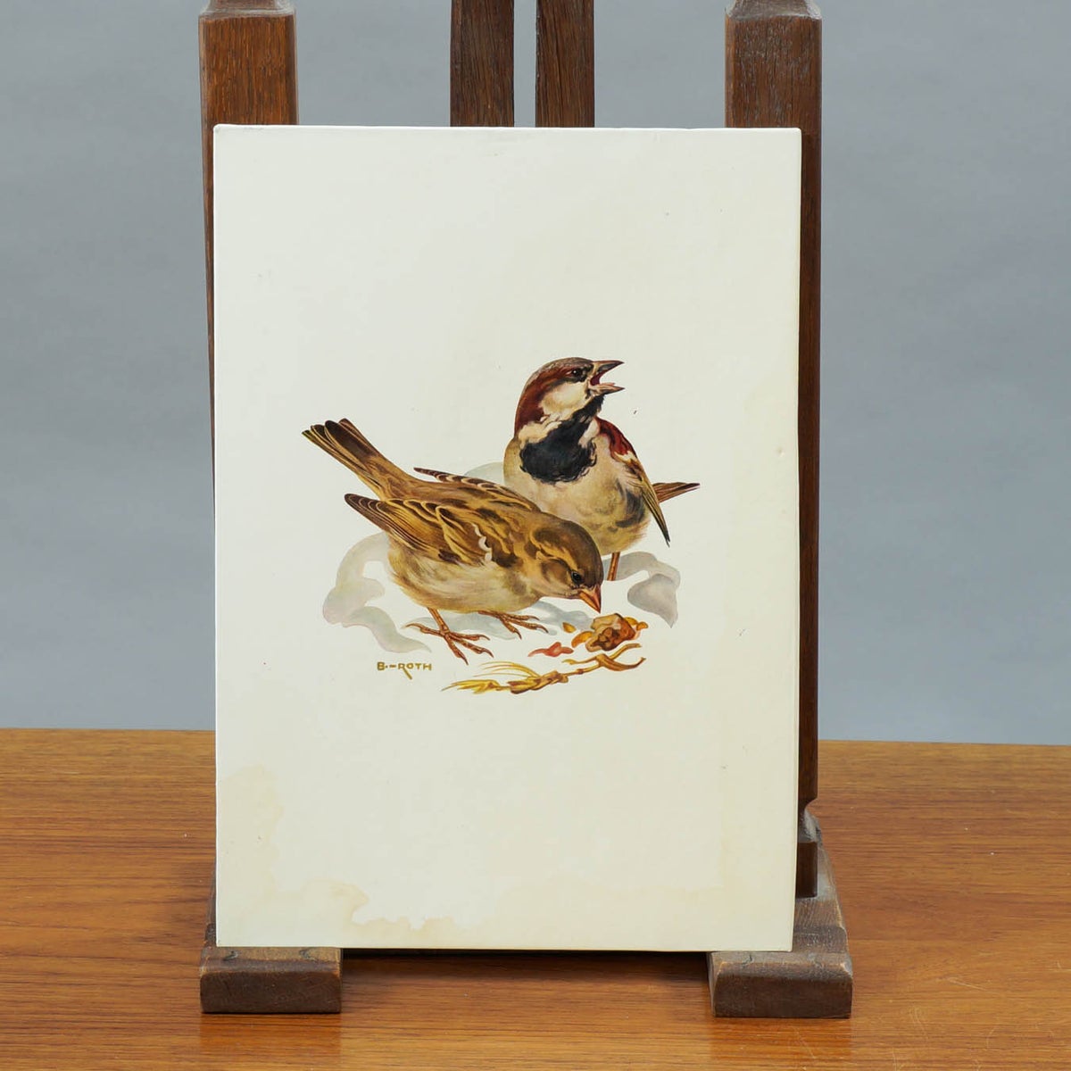 Kaunis 1960-luvulla valmistettu vintage-opetustaulu, joka esittää varpusia (Passer domesticus). Kuvassa näkyvät sekä koiras että naaras. Kuvitus on liimattu paksulle kartongille, ja taulun kääntöpuolella on käsin tehty merkintä ”Gråsparv”.
