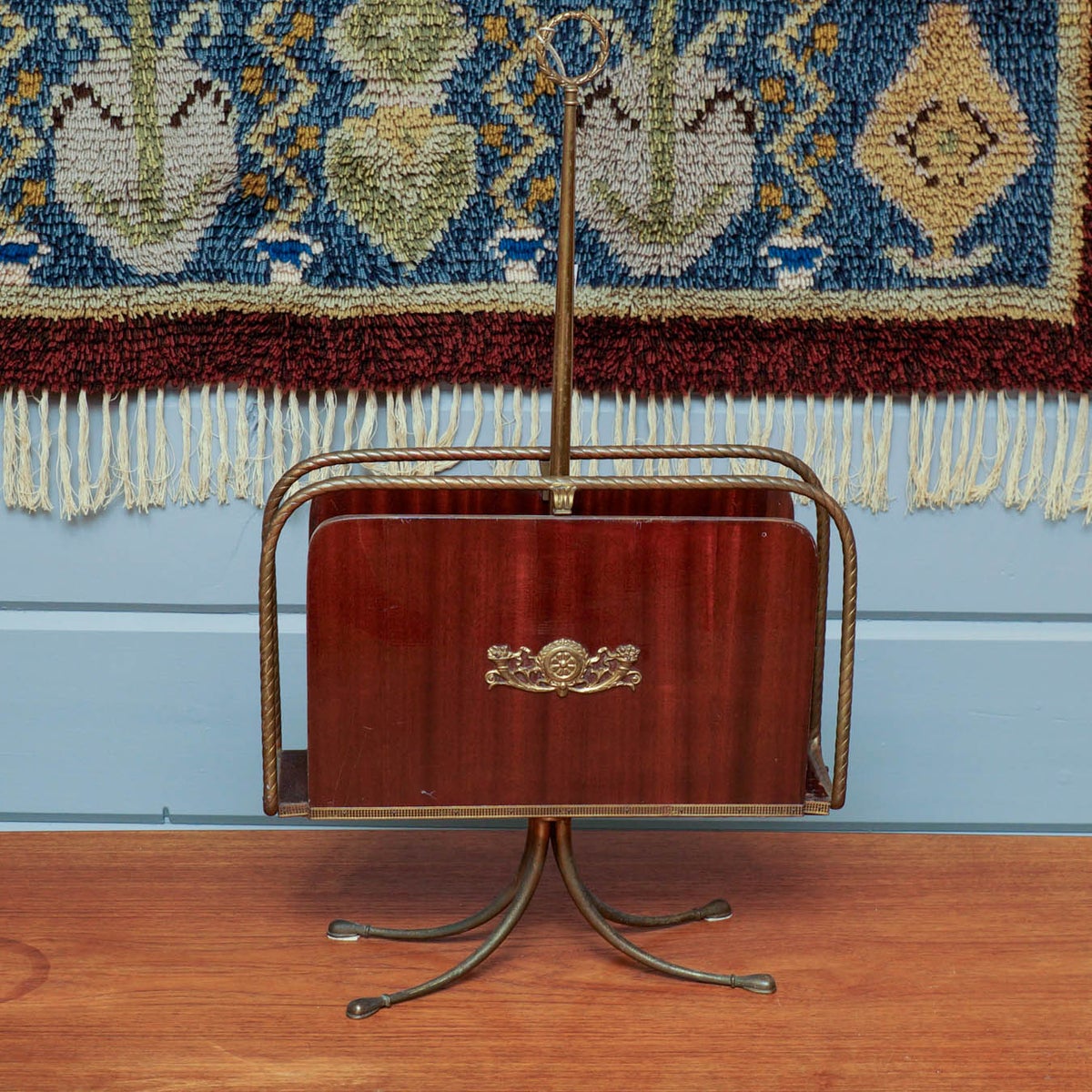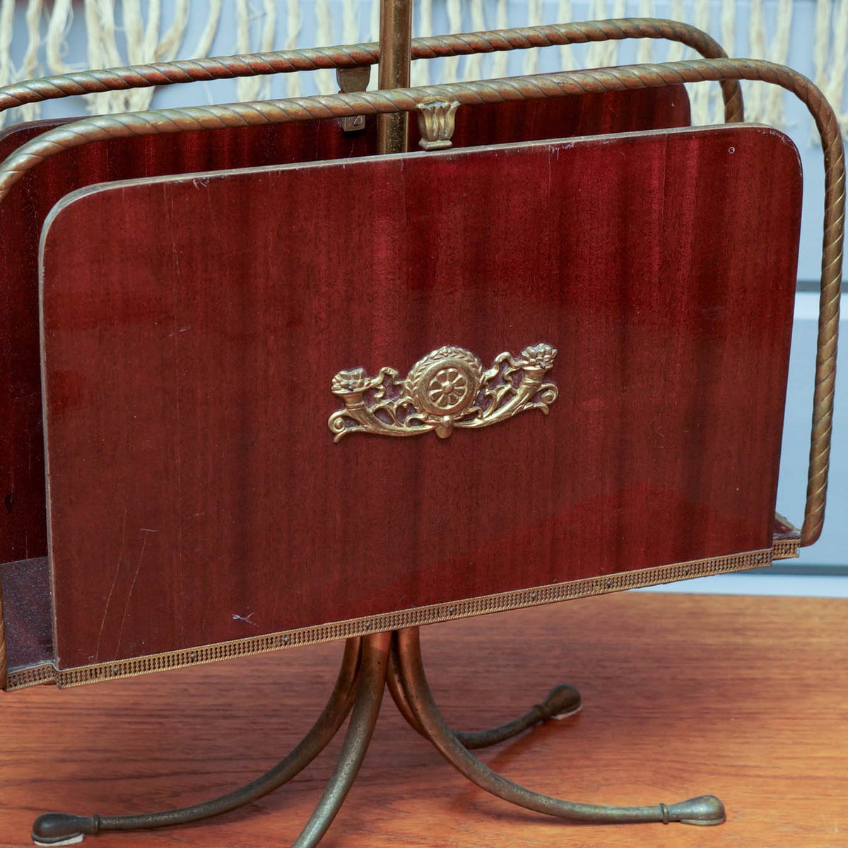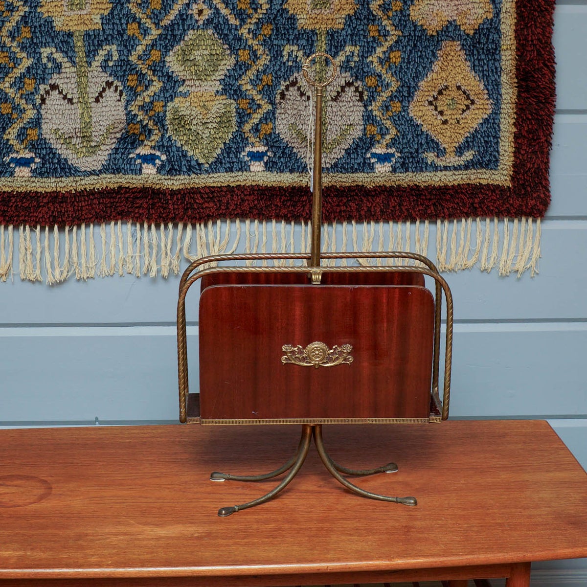Tyylikäs 1950-luvun lehtiteline, jossa yhdistyvät aikakauden elegantti muotoilu ja laadukkaat materiaalit. Telineen jalusta ja runko ovat messinkiä, ja sivulevyt on valmistettu kauniista mahonkiviilusta, jota koristaa koristeellinen messinkiyksityiskohta.