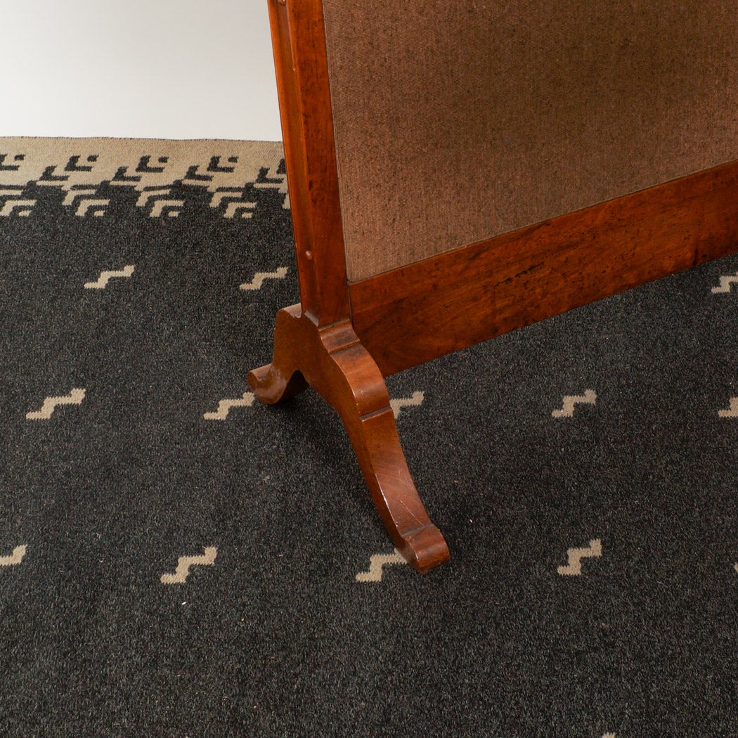 Biedermeier-tyylinen tulisijasermi, valmistettu massivipähkinästä ja pähkinäviilusta. Lakattu pinta korostaa puun syykuvioita ja antaa sille ajan patinaa kunnioittavan ilmeen. Etupuolen kukkakirjailtu kangaspaneeli ja kaareva ylämuotoilu ovat aikakaudelle tyypillisiä yksityiskohtia.