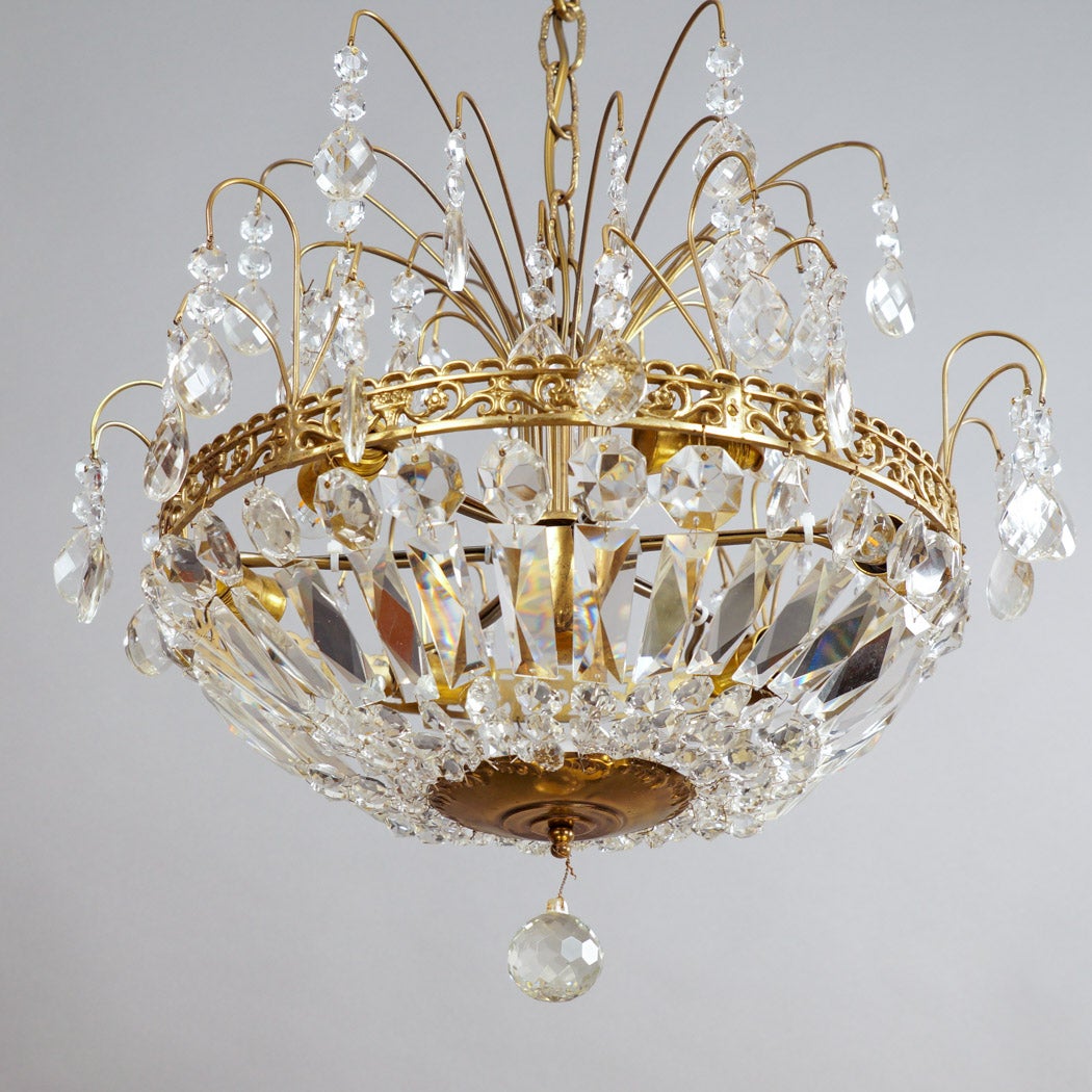 Messingin lämmin sävy ja vintage-kristallien valon taitto tekevät tästä valaisimesta näyttävän katseenvangitsijan, joka sopii niin perinteiseen kuin moderniin sisustukseen.