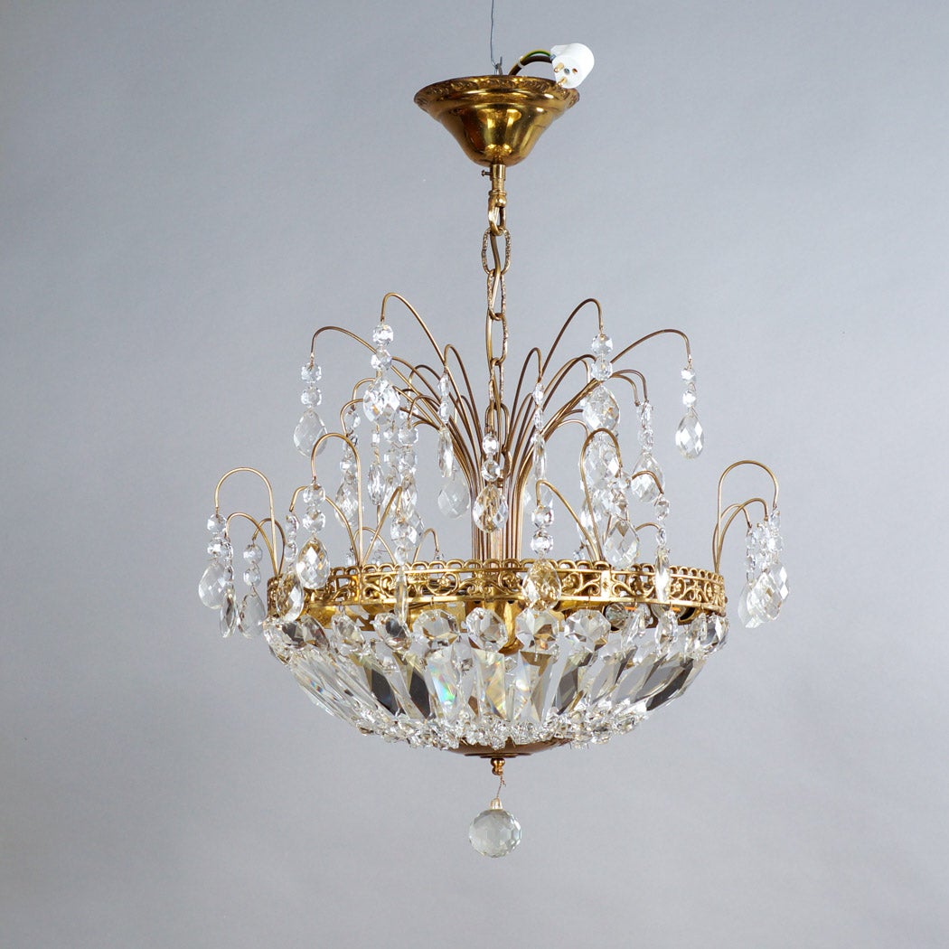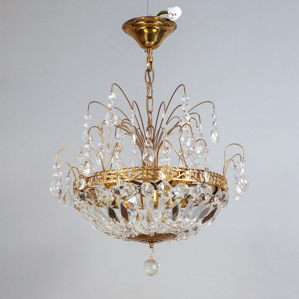 Upea vintage-kristallikruunu 1950/60-luvulta, jossa messinkinen runko yhdistyy kauniisti kimalteleviin kristalleihin. Kruunun ylellinen muotoilu — kaartuvat metallivarret, runsaat kristalliprismat ja pohjan näyttävä kristallipisara — luo elegantin ja ajattoman ilmeen, joka heijastaa aikakauden klassista tyyliä.