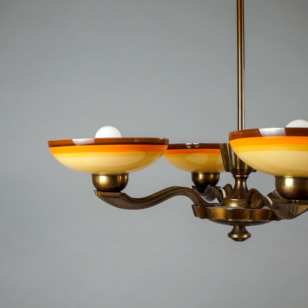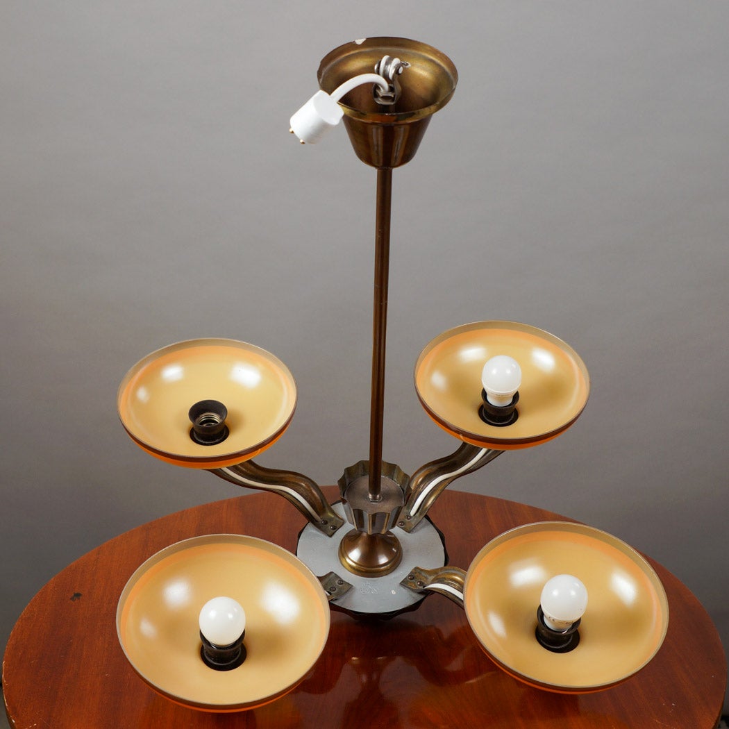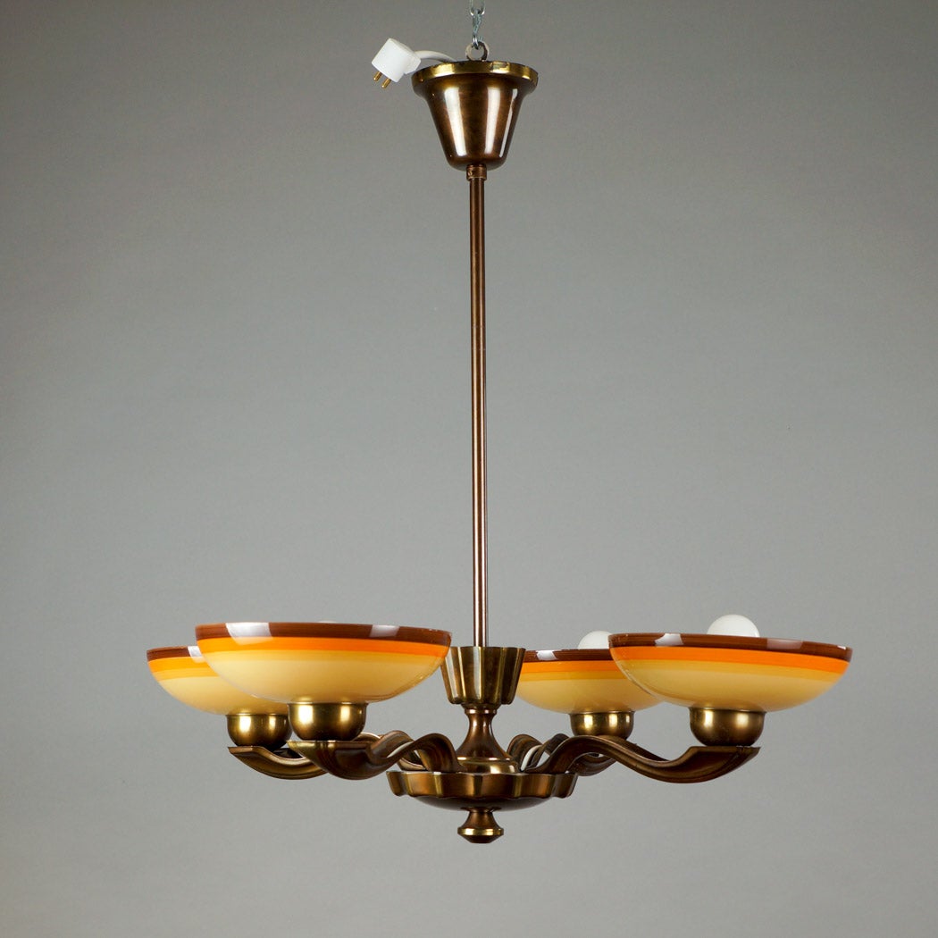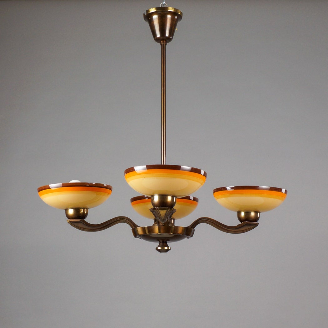 Upea art deco -henkinen kattovalaisin 1930/40-luvulta. Valaisimessa on neljä kauniisti kaartuvaa metallivartta ja tyylikkäät, kaksisävyiset lasikuvut, joiden lämmin keltainen ja ruskea väritys luovat pehmeän sekä ajattoman tunnelman. Messinkinen runko ja sulavalinjainen muotoilu edustavat aikakauden klassista estetiikkaa.