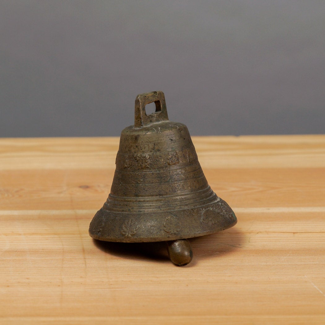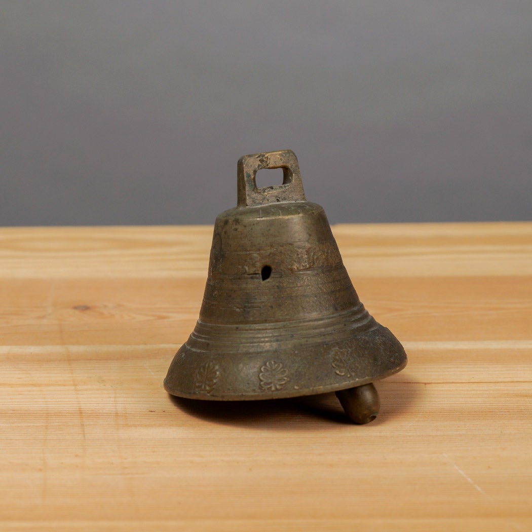 Kauniisti ikääntynyt messinkikello, jonka helmaa kiertävät hienovaraiset, kohokuvioidut kukkakoristeet. Kellon yläosassa on tukeva, suorakulmainen ripustuslenkki, johon on kaiverrettu vuosiluku 1938, mikä tekee esineestä erityisen mielenkiintoisen historiallisen yksityiskohdan.