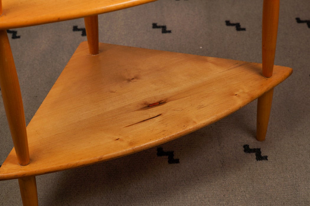 Kaunis ja tukeva vintage-kulmahylly 1950/60-luvulta. Hylly on valmistettu lakatusta koivusta, joka hehkuu lämpimän hunajaisena ja tuo esiin puun luonnollisen eläväisyyden. Kolmiomainen muoto ja kolme avointa tasoa tekevät siitä käytännöllisen säilytysratkaisun pieneenkin tilaan – täydellinen kulmiin, joissa kaivataan sekä ilmettä että toimivaa lisätilaa.
