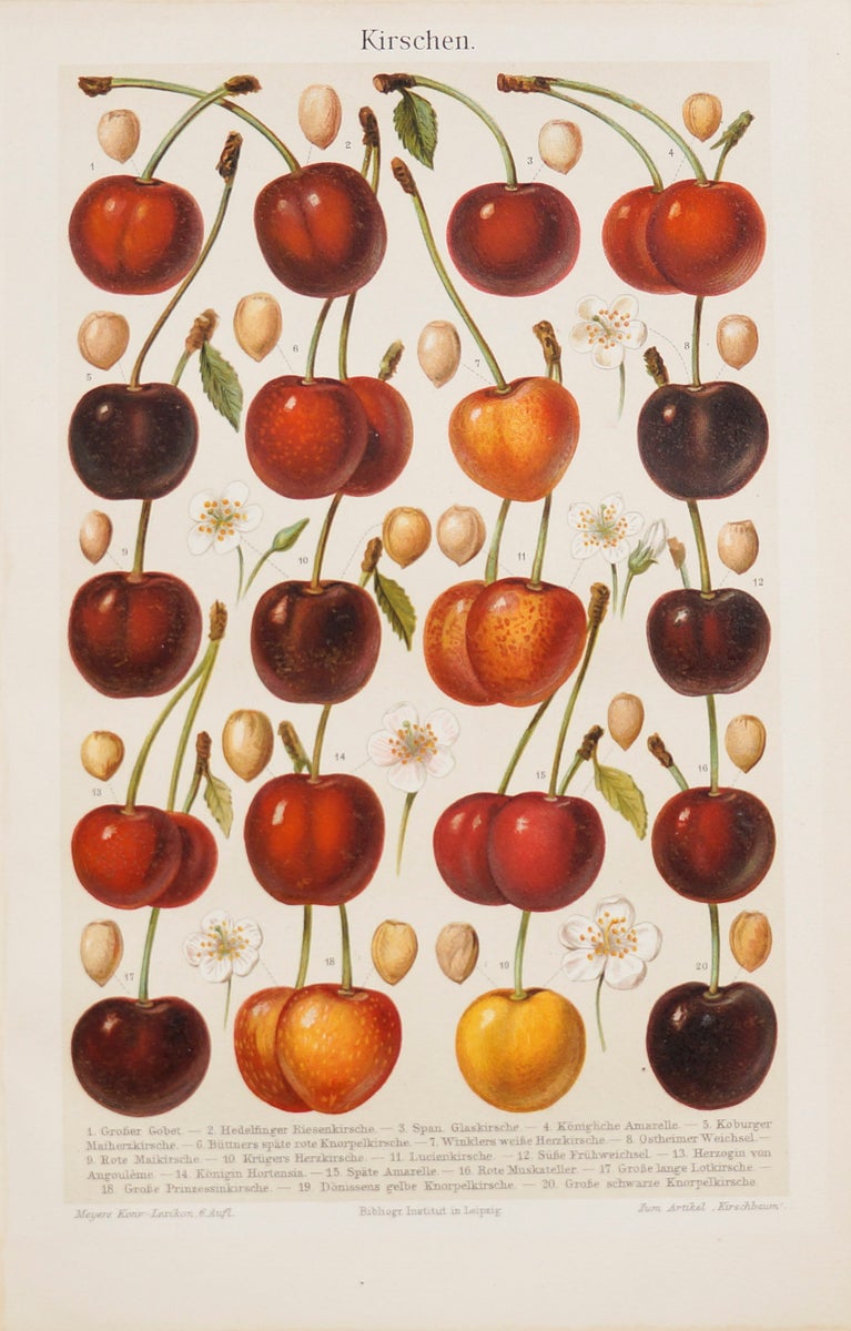 Teos on otsikoitu “Kirschen” ja se on painettu Saksassa 1900-luvun alussa, todennäköisesti osana Meyers Konversations-Lexikonin tai vastaavan aikakauden tieteellistä ja opetuksellista kuvaliitesarjaa.