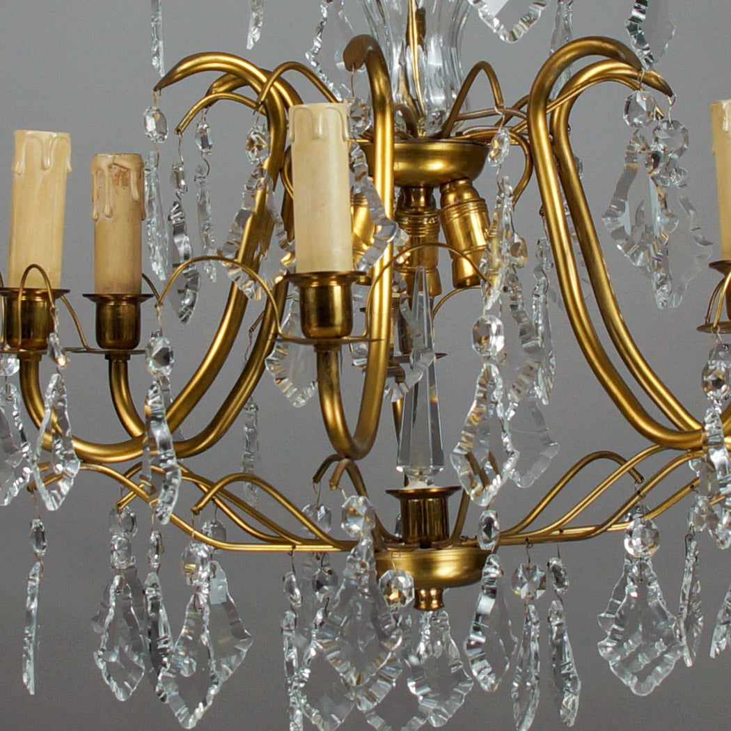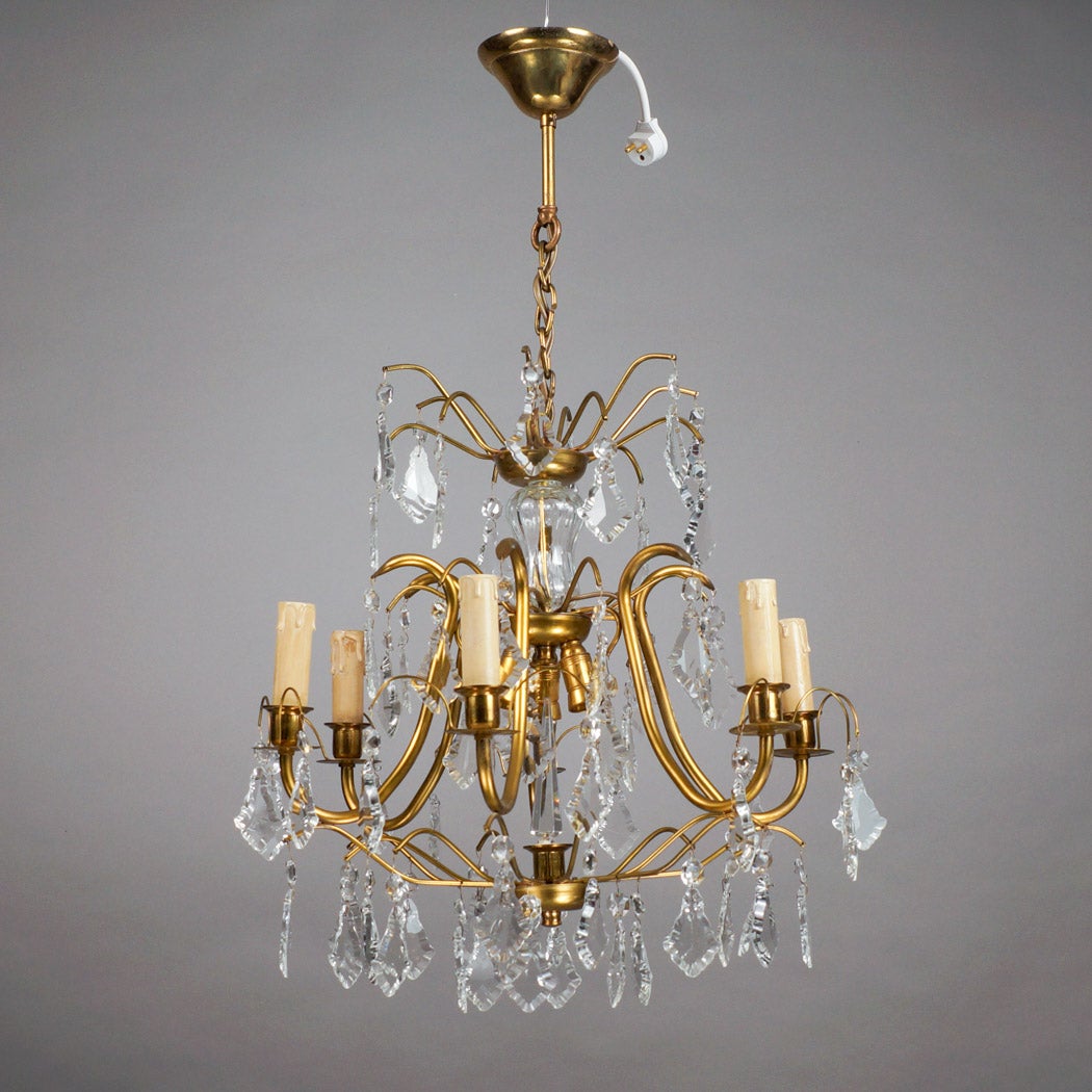 Upea ja arvokas 1940-luvun kristallikruunu, joka huokuu vanhan ajan eleganssia ja klassista tunnelmaa. Valaisin on valmistettu messingistä ja kristallista, ja sen kauniisti kaartuvat käsivarret sekä runsaat kristalliriipukset heijastavat valoa näyttävästi ja tunnelmallisesti.