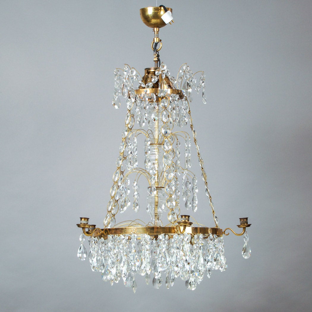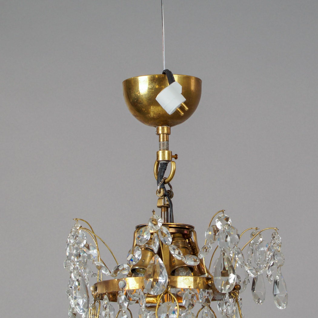 Näyttävä ja elegantti kristallikruunu 1940–1950-luvulta. Valaisin on valmistettu messingistä ja kirkkaasta kristallista, ja sen runsaat kristalliriipukset heijastavat valoa kauniisti luoden tilaan ylellisen ja klassisen tunnelman. Kruunun hienostunut muotoilu ja kirkkaat kristallit tekevät siitä tilan keskipisteen.