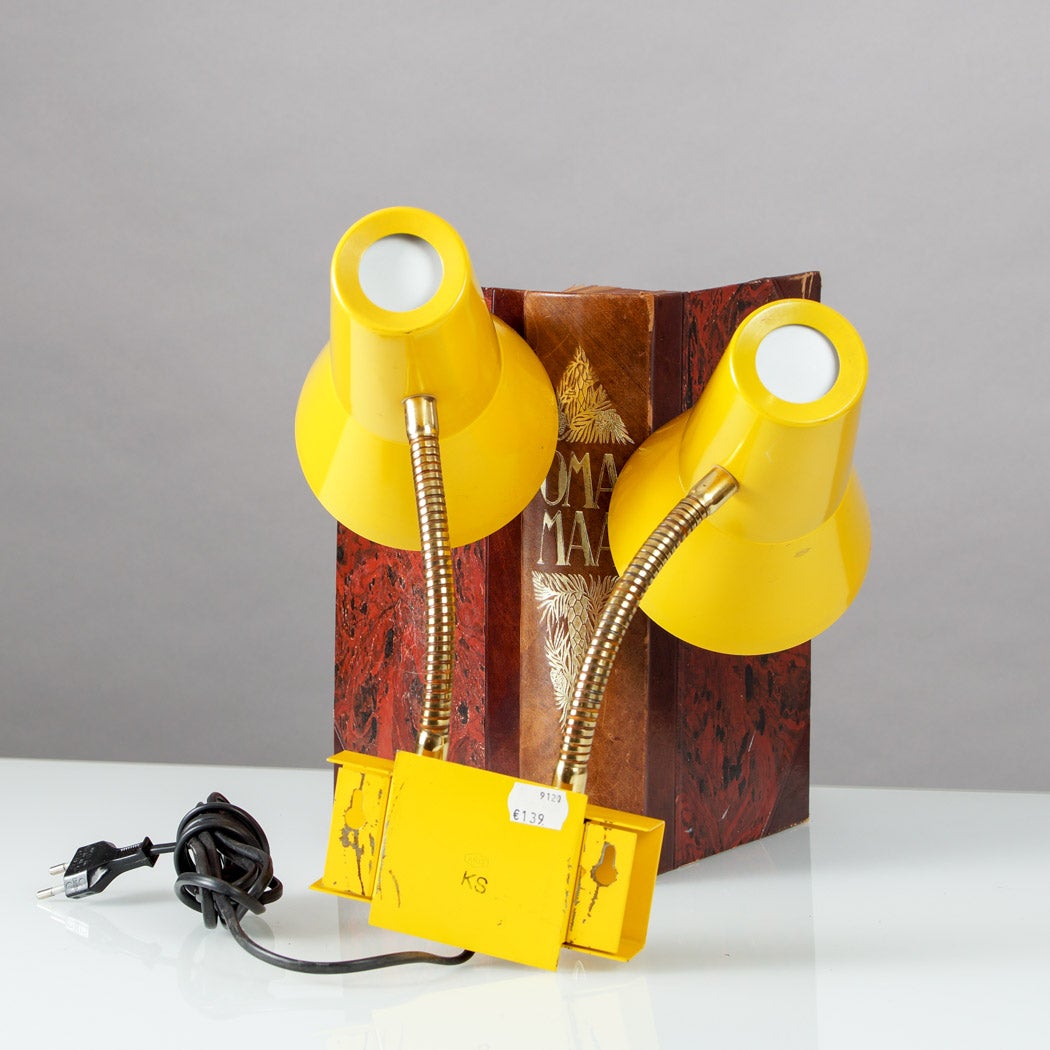 Valaisin on toimiva ja varustettu kahdella E27-lampunkannalla. Pinnassa on ajan patinaa ja käytön jälkiä, jotka ovat tyypillisiä aidolle vintage-esineelle ja korostavat sen luonnetta.