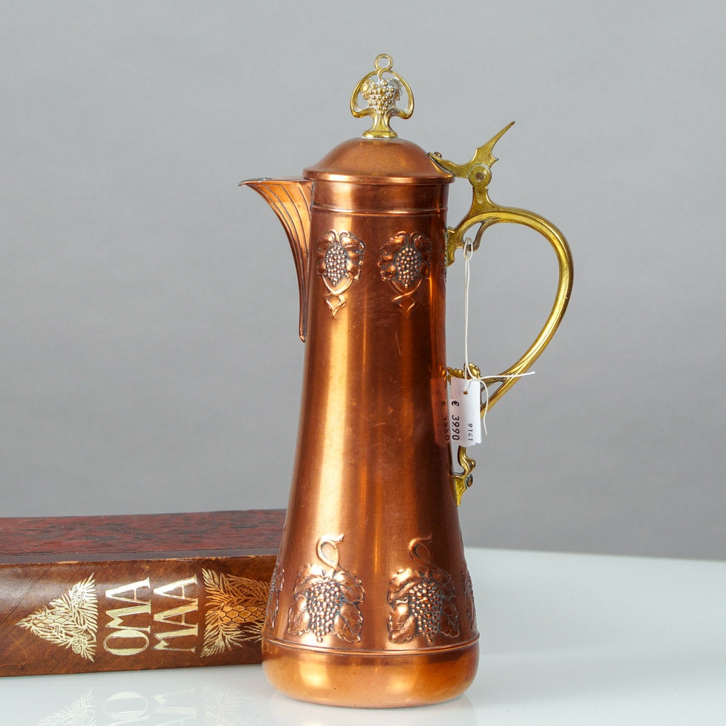 Näyttävä jugend-tyylinen viinikannu, jossa yhdistyvät lämminsävyinen kupari ja kauniisti patinoitunut messinki. Kohokuvioidut koristeaiheet, elegantti muoto ja yksityiskohtainen kansiosa tekevät kannusta ajattoman katseenvangitsijan niin vitriiniin, hyllylle kuin osaksi sisustuksellista asetelmaa.