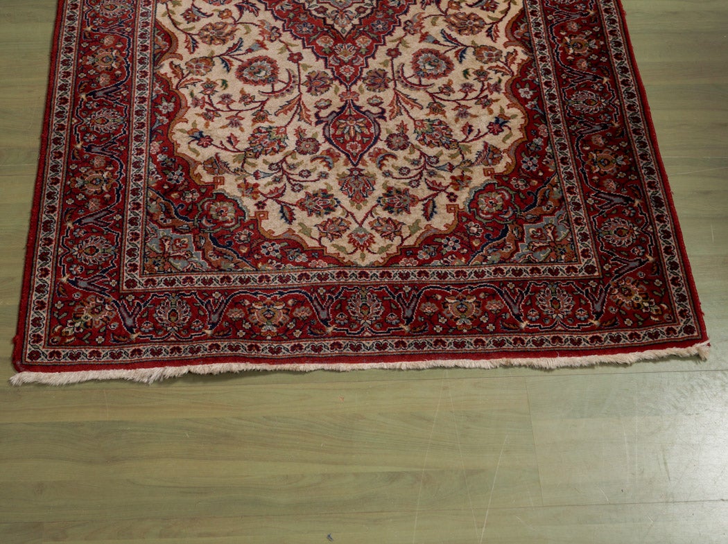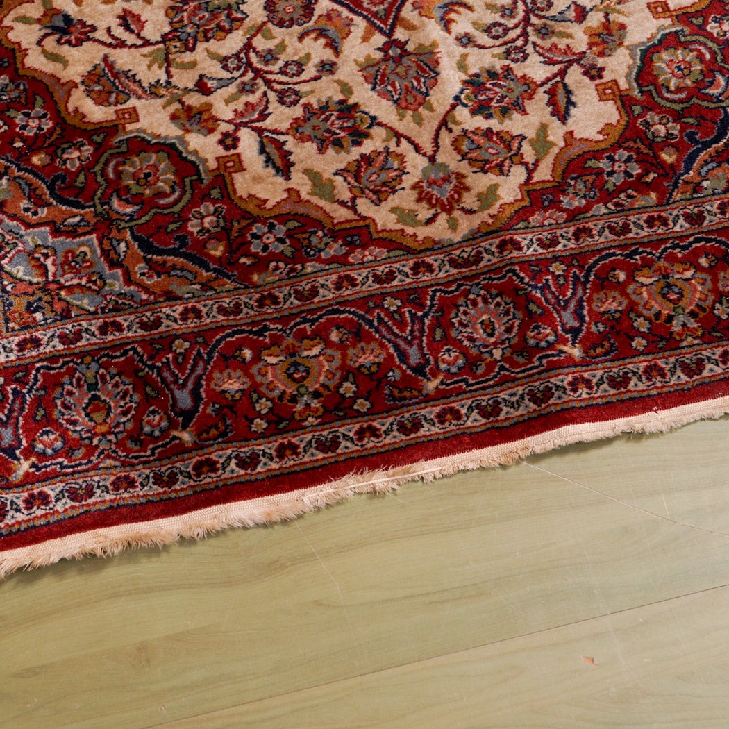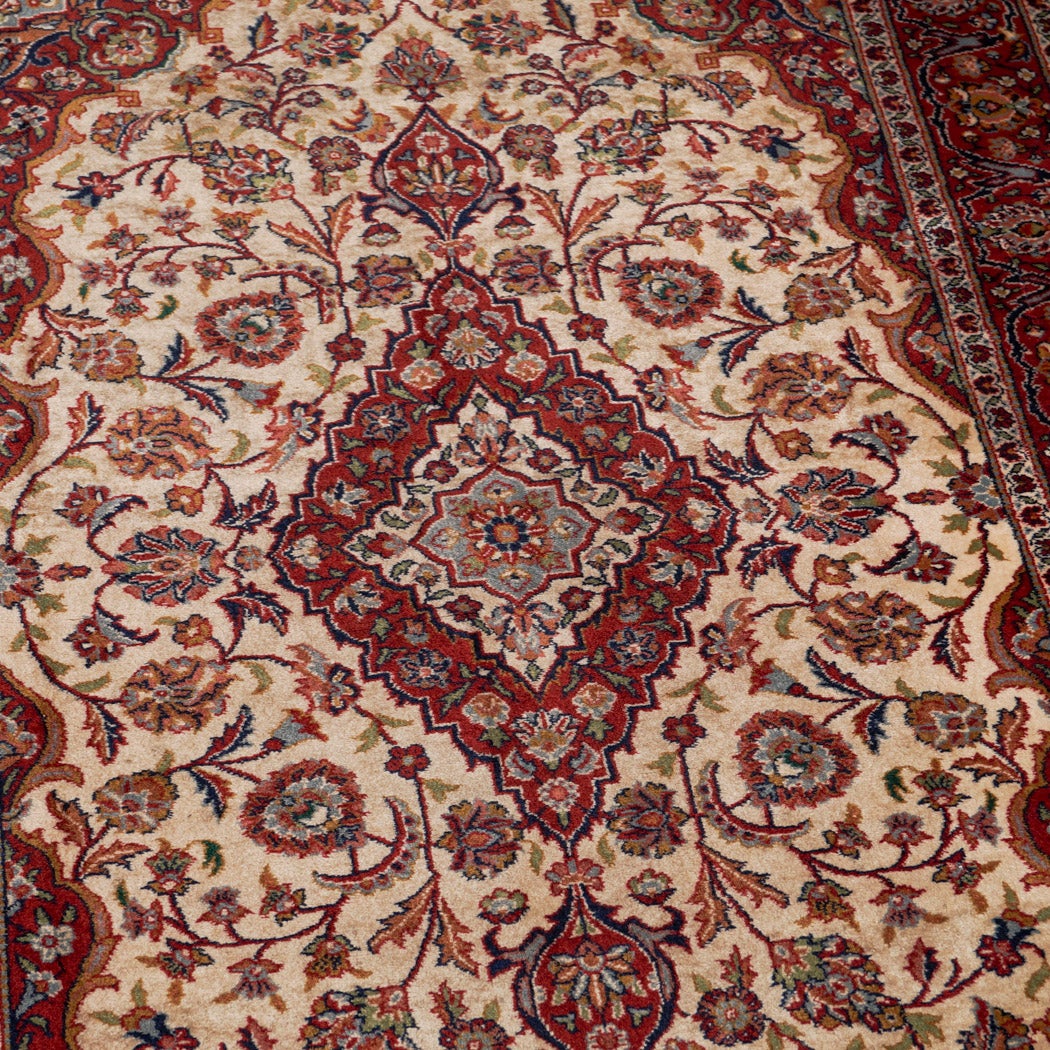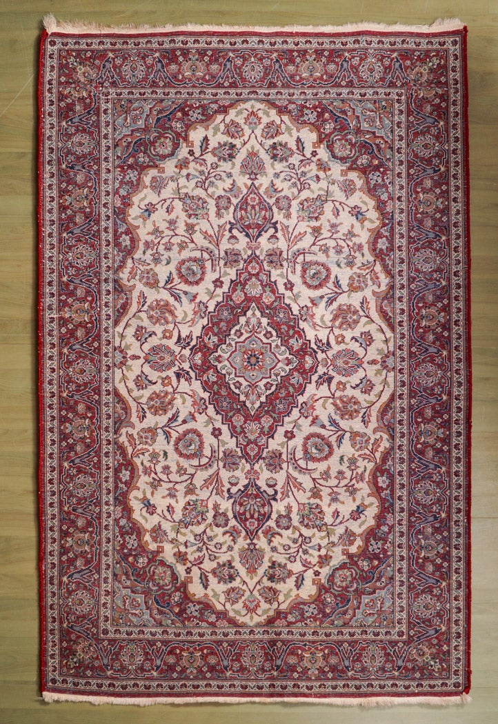 Maton värimaailmaa hallitsevat lämmin punainen ja norsunluunvalkoinen/beige, joita täydentävät siniset ja vihreät tehostesävyt. Kokonaisuus on tasapainoinen ja elegantti, ja runsas, hienopiirteinen kukka- ja köynnöskuviointi tuo mattoon syvyyttä ja arvokkuutta.